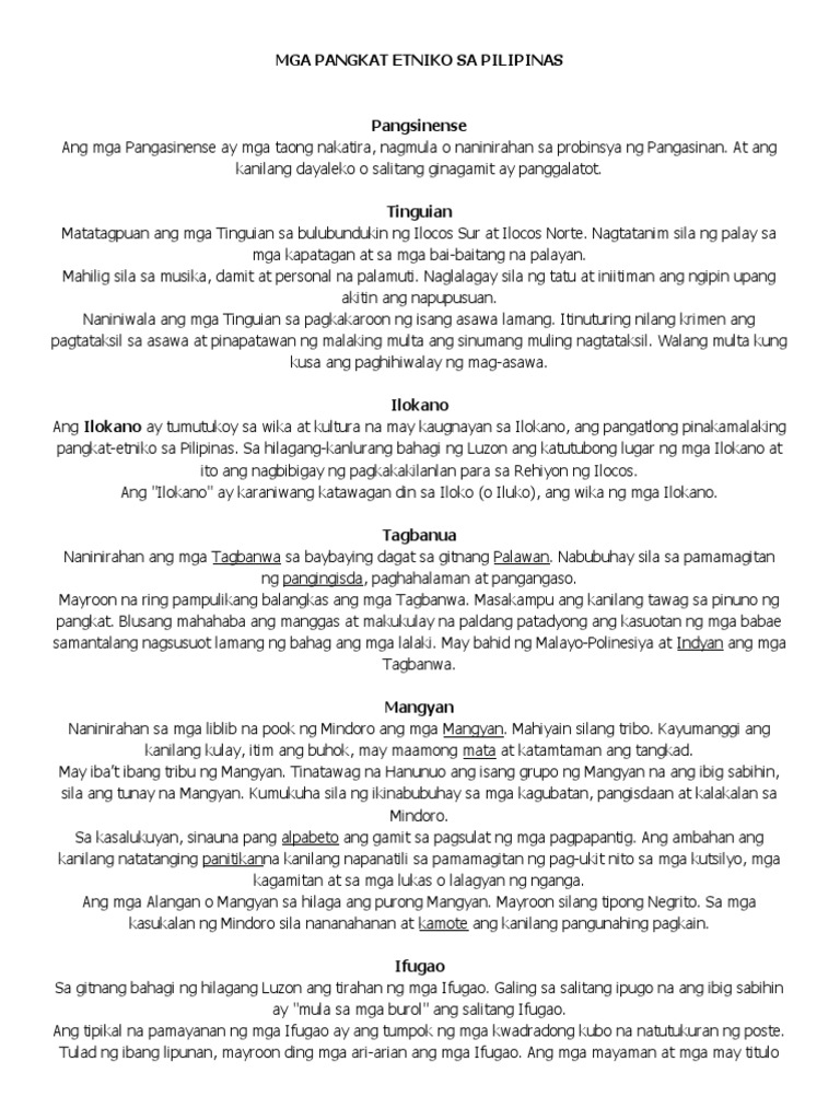 2021127 1 Mga pangkat ng Pilipino 2 Mga katutubong pangkat etniko 21 Pangunahing Pangkat Etniko 22 Pangkat etniko sa Luzon 221 Mangyan 222 Ifugao 223 Kalinga 224 Itawis 225 Kankana-ey 226 Ilongot 227 Ibaloy 228 Isneg 229 Ivatan 2210 Mga Tao ng 23 24. 2021314 ng mga Hiligaynon ay napakaiba rin sa mitolohiya ng karatig na mga Suludnon. Mula hilaga hanggang timog ang pinakamarami sa mga pangkat na ito ay ang mga Ilocano Pangasinense Tagalog Kapampangan Bicolano at Bisaya.